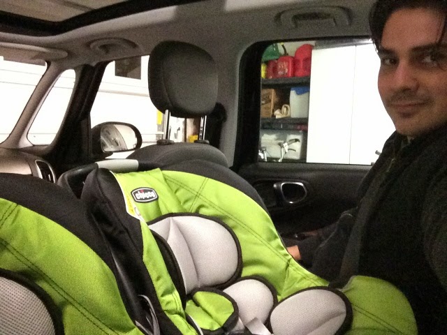 Notice André is in the backseat with the two car seats, buckled in, door closed, AND comfortable. Fiat 500L 1, Minivan 0. Go Fiat!